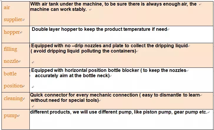 Þessi vél er sérstaklega gerð fyrir alls kyns seigju/vökva í matvælaiðnaði, efnaiðnaði og vöru, svo sem vélarolíu, mótorolíu, salati, handþvottageli, kókosolíu, sojabaunasósu, sesam, sjampó, fljótandi sápu, vélarolíu , bremsuolía, matarolía, tómatsósa, drykkur, ilmkjarnaolía, jurtaolía, hunang, piparsósa, hnetusmjör, jógúrt, safi, drykkur o.s.frv. Allur hluti vökvans/sósunnar sem snertir sig er hágæða ryðfríu stáli.Vélin samþykkir stimpildælu til áfyllingar. Með því að stilla stöðudæluna getur hún fyllt allar flöskurnar í einni áfyllingarvél, með miklum hraða og mikilli nákvæmni.